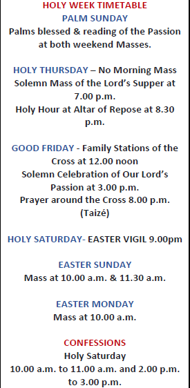 HomeUncategorizedHoly Week TimetableHoly Week Timetable Related PostsChild Safeguarding& Protection Service Newsletter January 2026Saint Josephs Parish is part of South Dublin Deanery No. 2Congratulations to the girls of Presentation and Stratford national schools